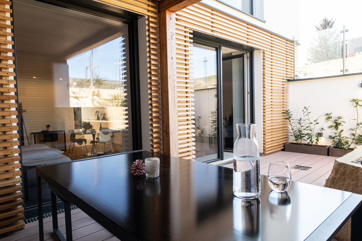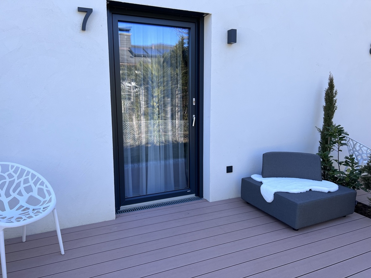 Das besondere studioAPPARTMENT mit moderner Küche, Infrarotkabine und einer überdachten Terrasse mit echtem Sandstein aus St. Margareten.