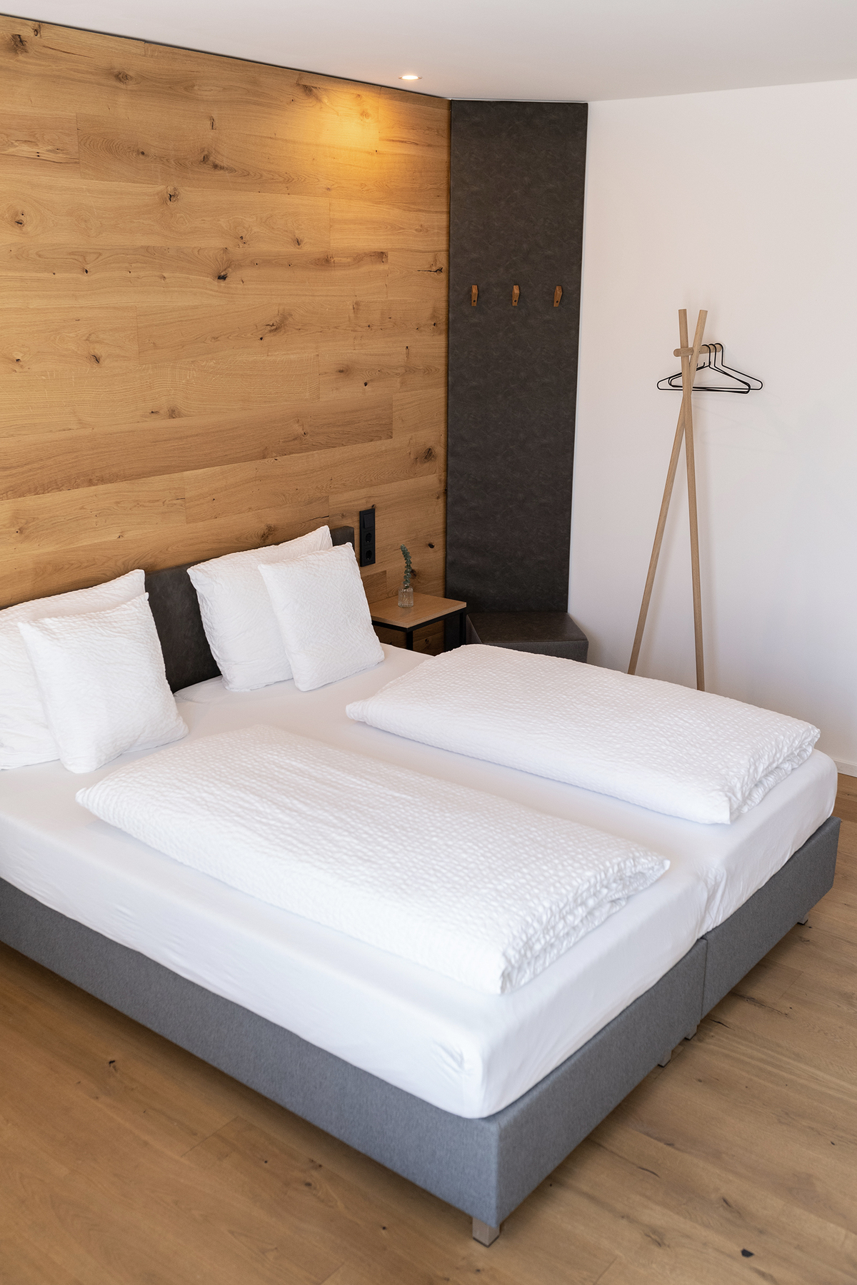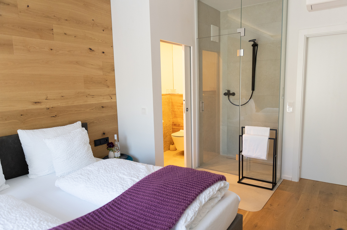 Einzel- bzw. Doppelzimmer mit exklusivem Design. Die Dusche als gläserner Blickfang im Raum.