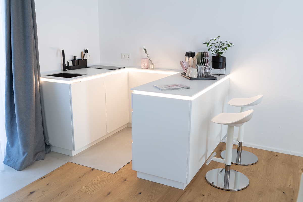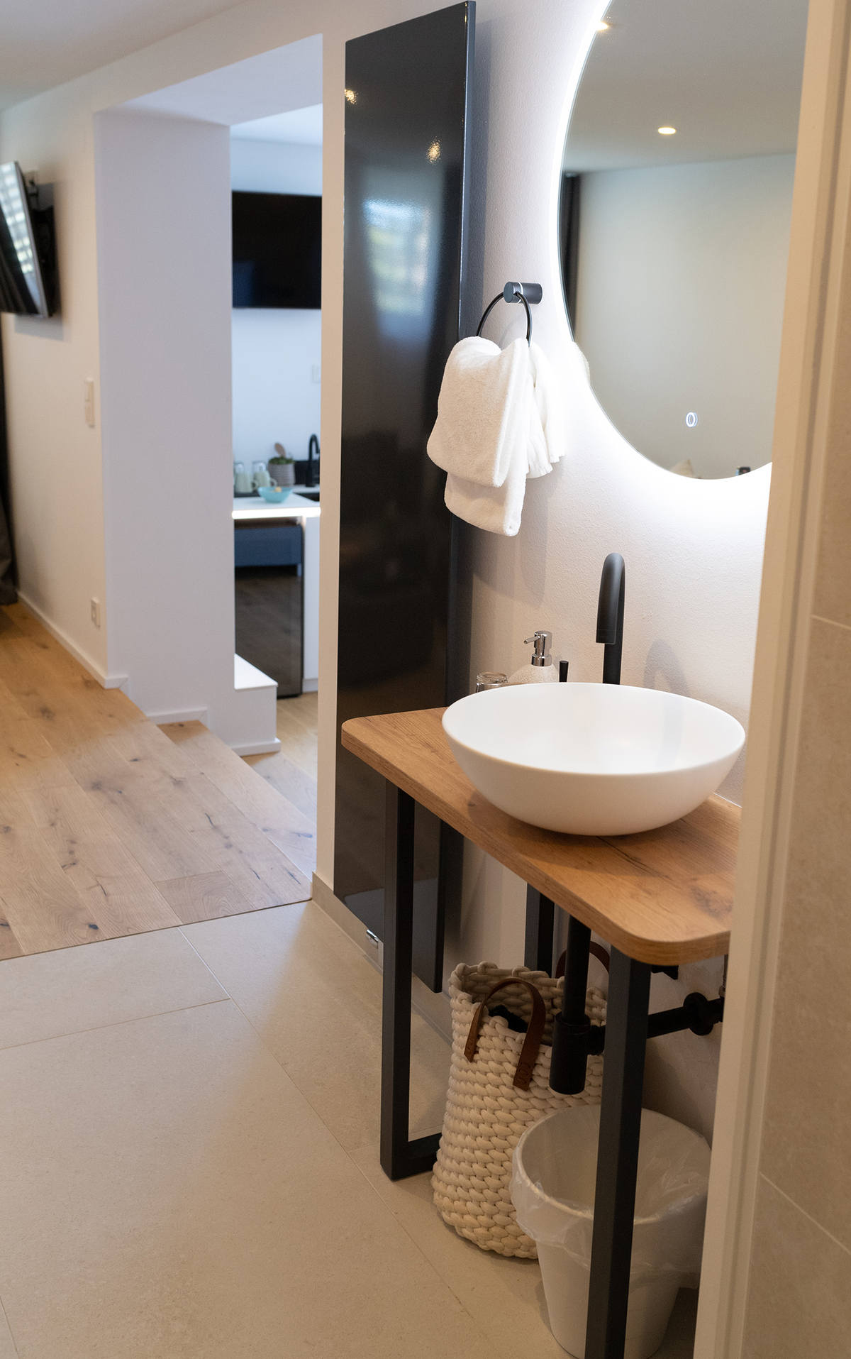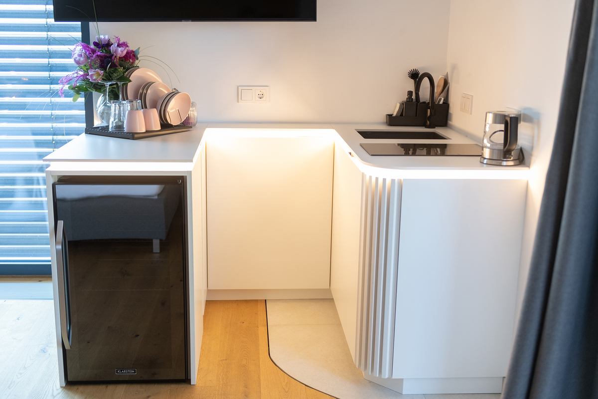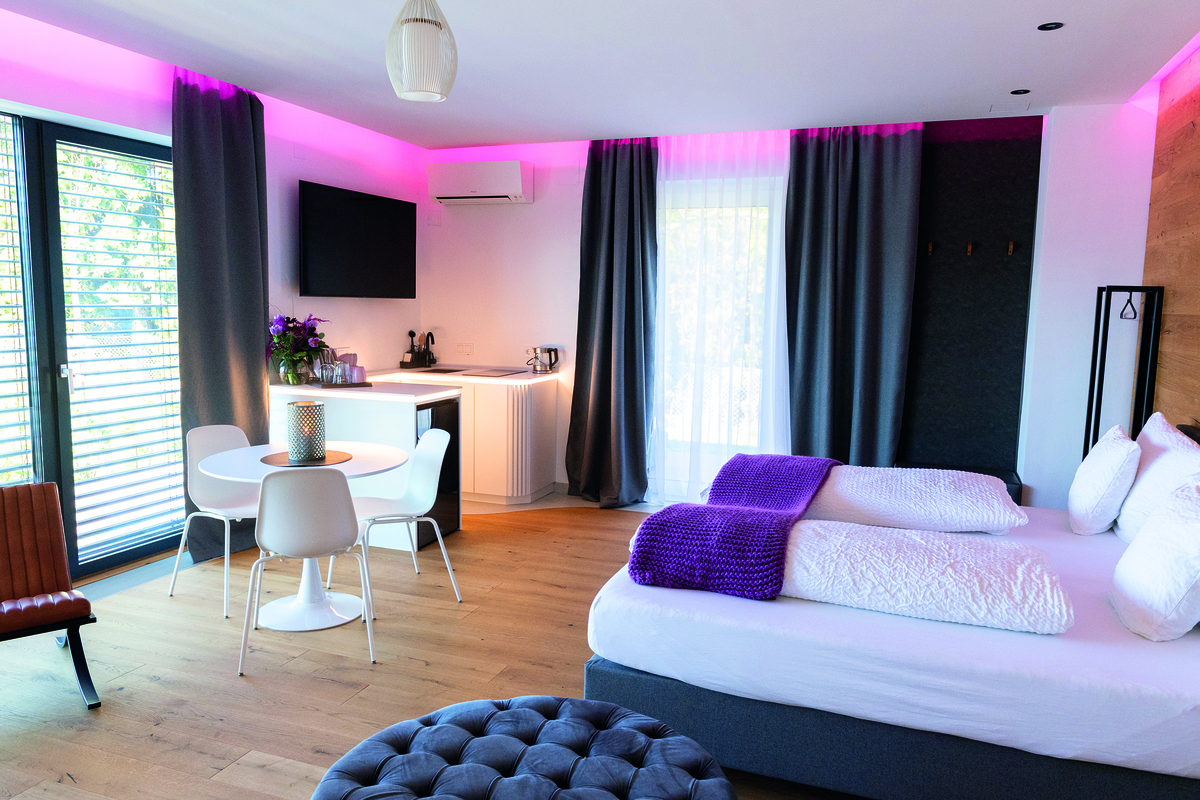 Unsere Junior Suite mit kleiner Küche, freistehender Badewanne und Doppeldusche. Ideal auch für ein romantisches Wochenende.